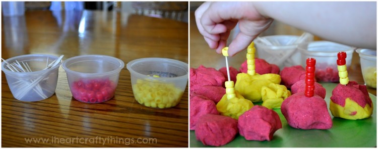 To extend the activity further I also set out some plastic cups with toothpicks, red pony beads and yellow pony beads. It was excellent fine motor practice to poke the toothpicks into the playdough and string the corresponding color of beads on the toothpick.
