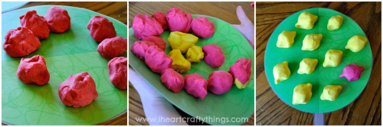 To make our lemon scented playdough, we used The Imagination Tree’s Best Ever No-Cook Play Dough Recipe. It is my favorite no-cook recipe and turns out silky smooth every time! After making the playdough, I divided it in half and colored one half yellow and the other red. I also added red glitter in the red portion because the book talks about the red lemons being even more sweet than regular yellow lemons.