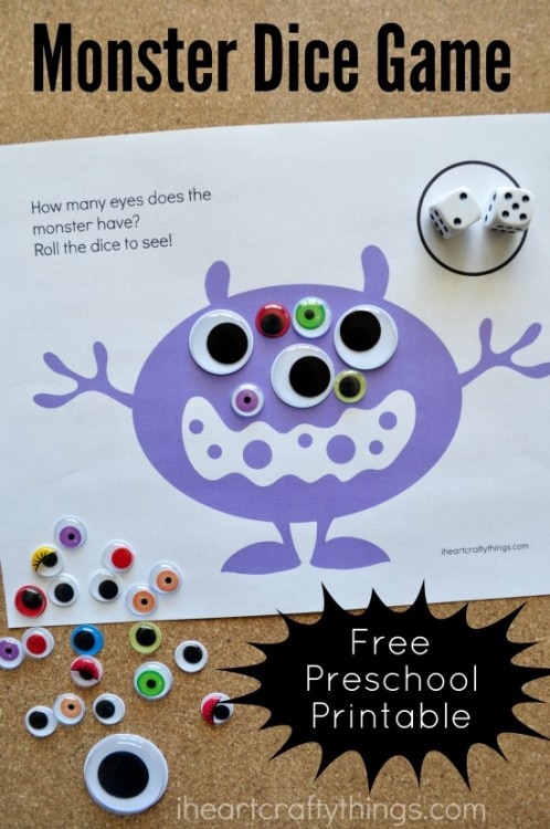 Using dice is a simple way for preschoolers to practice counting and learn basic addition and subtraction. We used them in our our recent Pumpkin Candy Addition Activity and my daughter loved it, so I put together another fun preschool math activity for her with a Halloween monster theme. In true monster fashion, we used googly eyes for our counting manipulatives. After downloading the monster eyes counting game preschool printable, get ready for some good giggly fun making silly monsters.