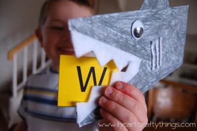 And you say, “Mr. Shark is hungry for the letter…(and say a letter).” Your child finds the correct letter and feeds him to your shark while you say “Chomp, chomp, chomp!”