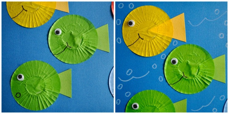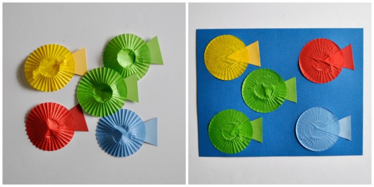 2. Glue the triangle fins onto the mini cupcake liners and then glue the fish onto your blue cardstock paper.