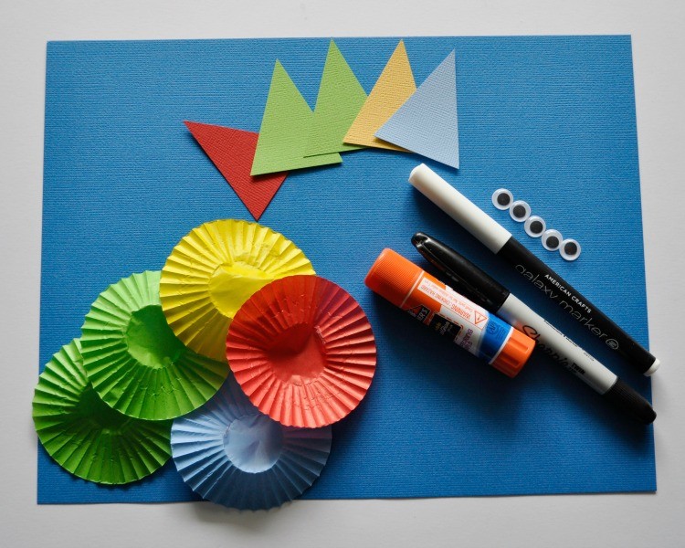 1. Start by cutting out triangles for your yellow, red, blue and green mini cupcake liners. These will be the fish fins.