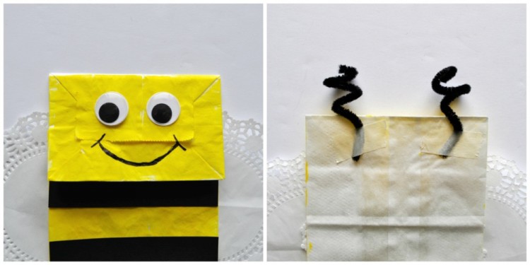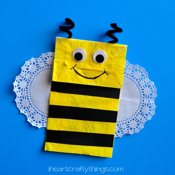 My friend over at Artsy Momma recently made an adorable Paper Bag Ladybug Craft. While I was making our balloon print bees earlier this week I remembered that cute ladybug craft and a light bulb went off in my head to make a Paper Bag Bee Craft. We used doilies for the bee wings and I think it turned out so cute! Read below how simple it is to make.