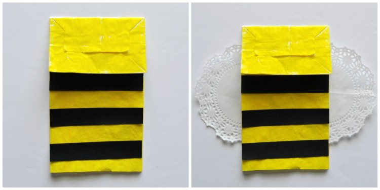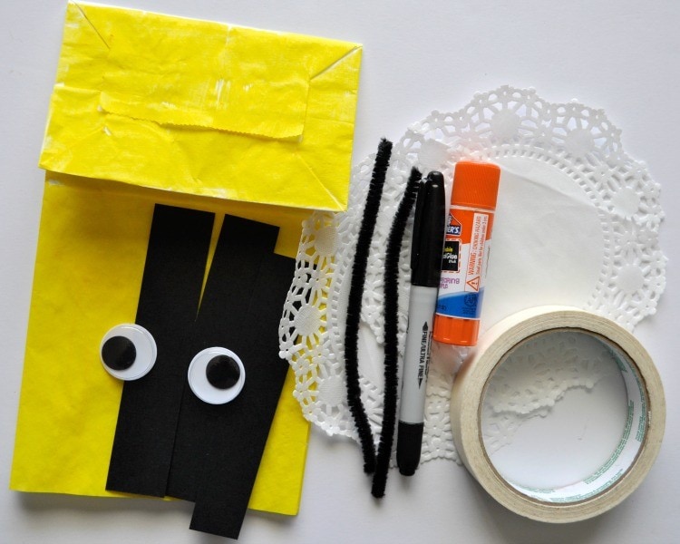 Cut three 1-inch strips from your black cardstock paper for the bee stripes. Glue them onto your paper bag making stripes of yellow and black.