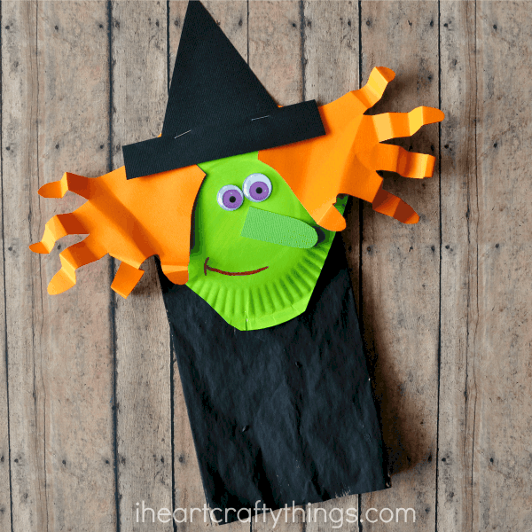 4. Fold the fingers of your handprints accordion style to make your witch’s hair curly. Staple each handprint onto your paper plate for the hair. Then staple your witch hat at the top of the paper plate.