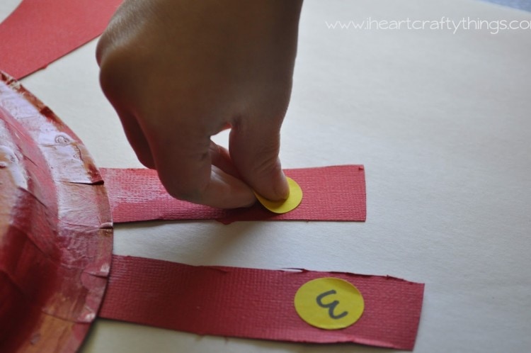 Cut four 1″ x 8 1/2″ red strips from your red cardstock paper for the back legs. Cut those strips in half to make 8 legs. Cut 2 more strips about 2″ x 5″. Cut claws at the ends of those strips for the front legs. (Note: I drew lines on our paper to divide the 1″ strips for the legs and let my preschooler cut out all the strips herself for cutting practice. I helped her cut out the claws though.)