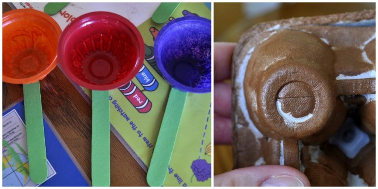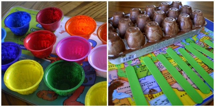 1. Start by painting the inside of your fruit cups all of the colors of the rainbow (No need to paint the outside). We threw in some pink and a couple different shades of blue as well. Also, paint your wooden craft sticks green and the bottom of your egg carton brown. We used acrylic paint. Let the paint dry completely.