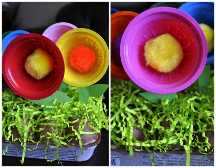 3. While you have the hot glue gun out, glue a large pom-pom in the center of each cup. Try to use a variety of different colors instead of just yellow. I let my kids choose the colors and place them inside the cups once I had put some hot glue in them. Then my kids cut some stems out of green paper and glued them onto the stems with school glue.