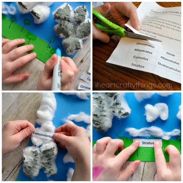 4. Next, cut out the cloud labels from the Preschool Cloud Activity Printable and line them up next to your cloud picture. Use the book as a guide again and discuss what each cloud is called, find the correct label for each of your clouds, and glue them onto your cloud picture.