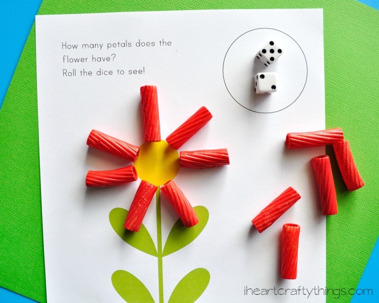 Today I’m excited to share this quick and easy Flower Dice Game Printable that is a fabulous math activity for preschoolers. It is inspired by several I have seen over at Glued To My Crafts, like her Easter Dice Game and Snowman Dice Game. Not only is this game super simple, but it’s great for practicing counting and I love how it uses fine motor skills to put those petals all around the flower.