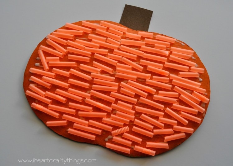 4. Once your cardboard pumpkin is dry, spread school school on a small section of your pumpkin and start adding on your orange straws. Continue adding glue in small sections, following with adding the straws until the entire pumpkin is full. You are left with a fun textured pumpkin.