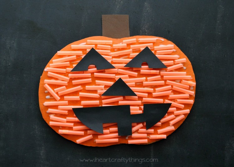 6. Finish your pumpkin by cutting a jack-o-lantern face out of black cardstock paper and gluing it onto the top of your straws. I cut this face out for my preschooler, but this is something a preschooler could easily do themselves as well for even more cutting practice.
