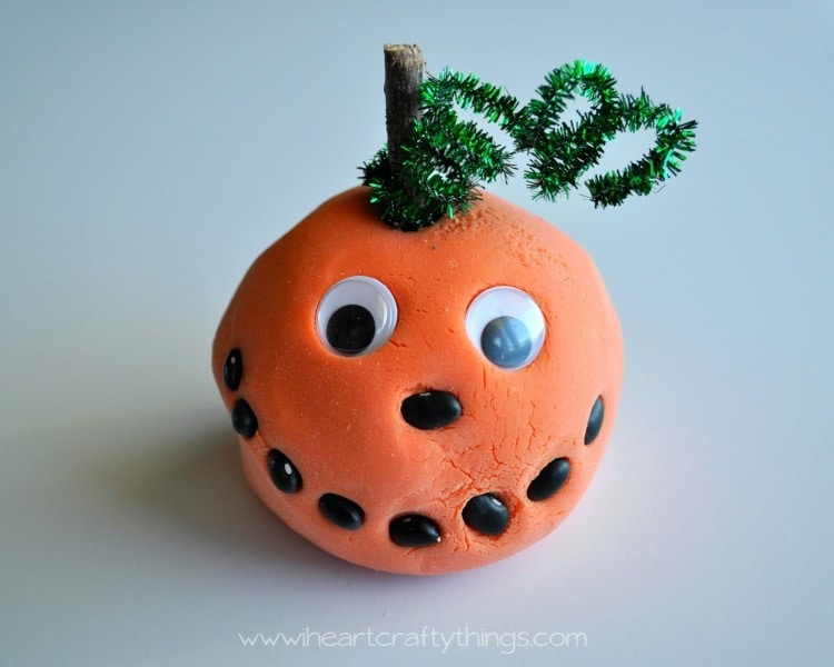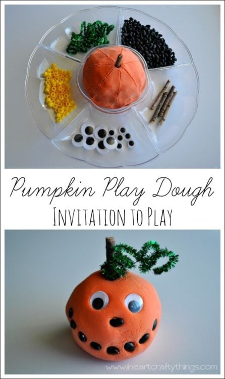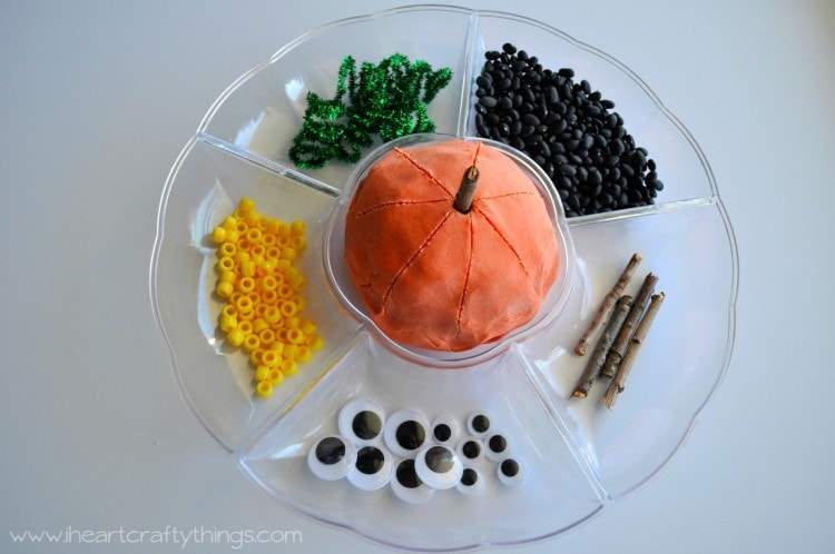 . In our tray I also included small twigs, black beans, Googly Eyes, yellow pony beads and green shimmer sticks/pipe cleaners (I curled them around a pencil so they resembled little curly vines). After completing our activity I did a search on Pinterest and saw a similar Play Dough Jack-o-Lantern Activity at B-Inspired Mom. Make sure to check that out for even more ideas.