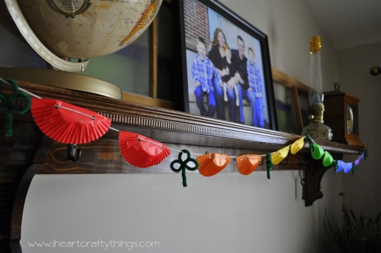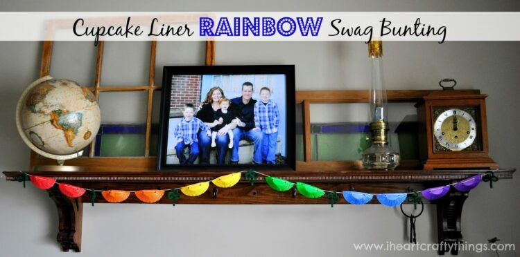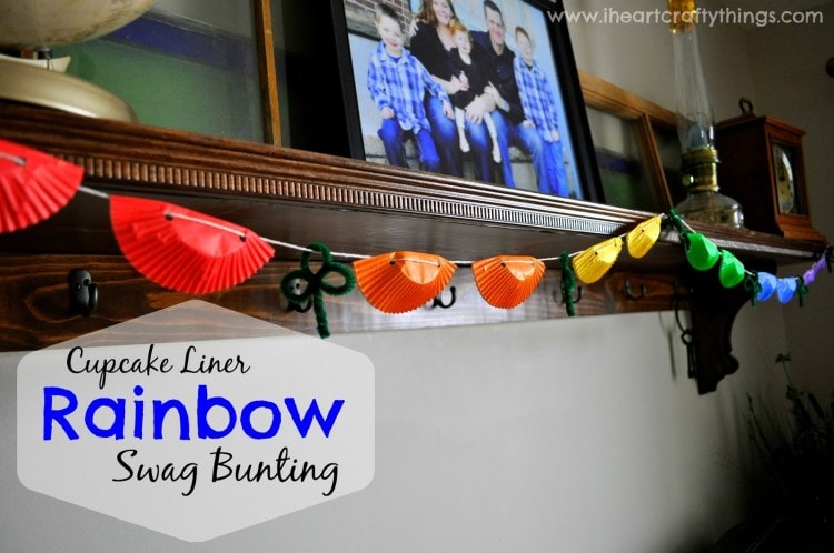 Since we had our cupcake liners out the other day to make our Rainbow Craft we decided to add some fun festive Spring decor to our front room and made a Rainbow Swag Bunting to hang on our mantle.