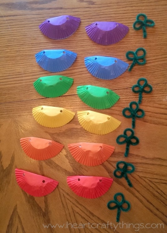 2. Press all of your cupcake liners out flat and then fold them in half. Punch two holes along the folded side of the liner with your hole punch to thread your string through them. I used the circular shape on the liner as my guide for where to punch the holes on each liner. I laid my  liners and shamrocks out on the table in color order with the shamrocks in line so they be would easy to grab and put on the string.