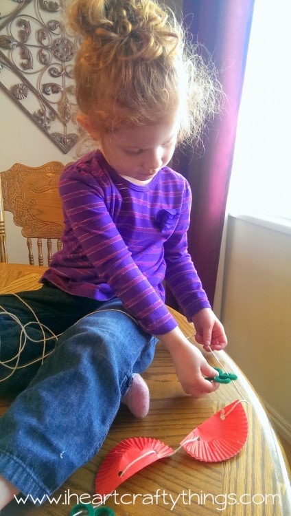 3. My big helper helped me string all the liners and shamrocks on my gold bakers twine in the correct order. We started with a shamrock, then 2 red liners, another shamrock, 2 orange liners, a shamrock, etc.