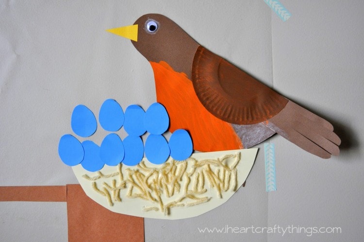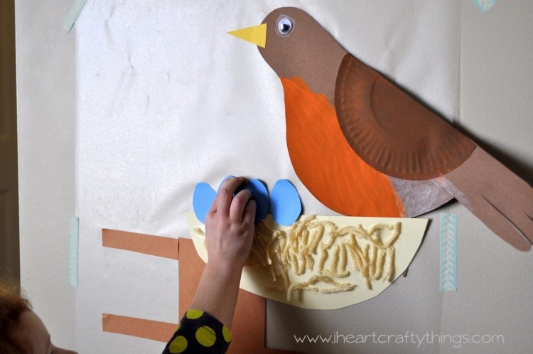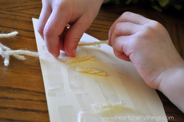 3. My daughter was able to help me with the birds nest. I cut a nest shape out of cream colored cardstock and I put strips of double stick tape all over it. I cut up a handful of cream colored yarn and then she helped me put the yarn all over the nest. This helped keep her occupied while I was putting the game board together.