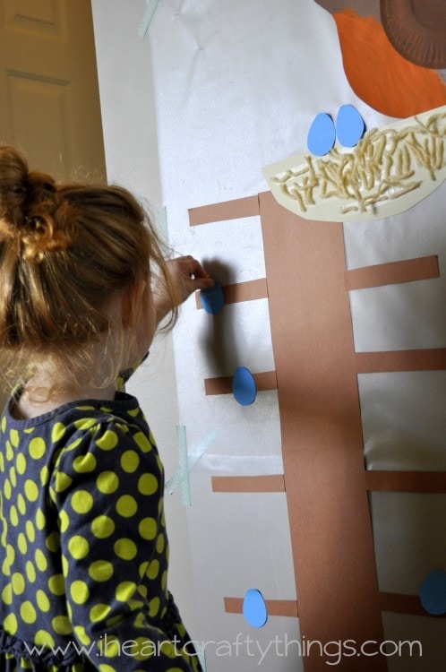 4. I cut 10 blue eggs out of cardstock reminiscent of robin’s eggs and put them along the bottom of the tree. I put the Robin and the nest at the top of the tree and the game was ready to be played.