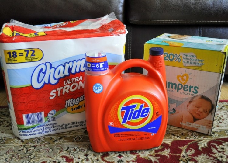 Among the items I purchased was Tide Laundry Detergent, Charmin Toilet Paper and Pampers Baby Wipes.