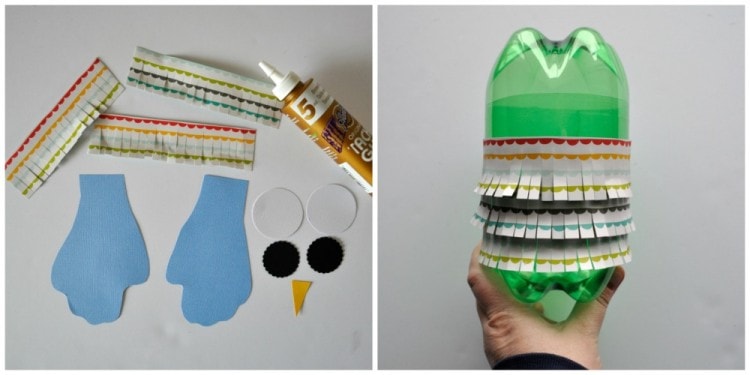 Next glue the scalloped circles onto your white circles. Glue your eyes and beak onto your soda bottle.