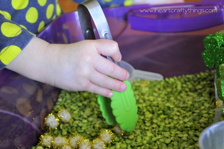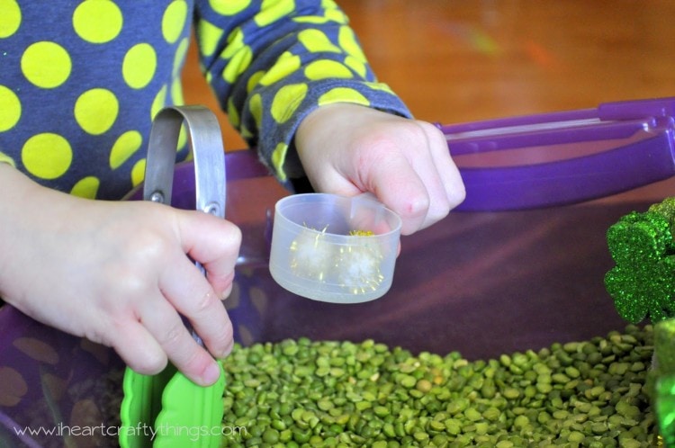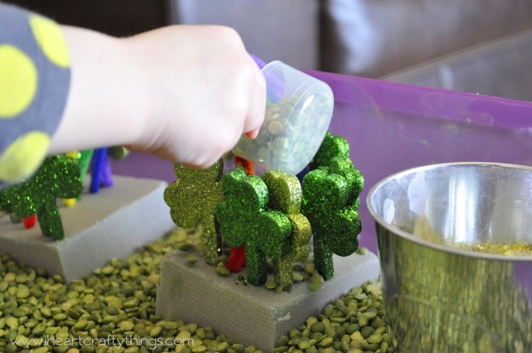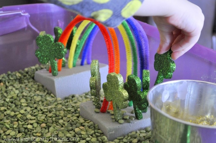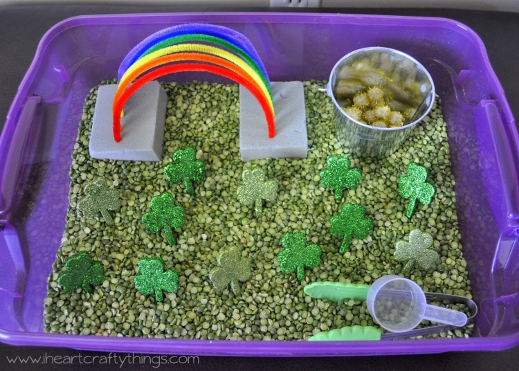 I set up a rainbow along the back of the bin and to go along with the old age saying, I added a pot of gold at the end of the rainbow. I also used split peas as my base to act like a clover field. I think the little glitter foam shamrocks placed in the bin really helped me achieve that clover field look I was going for too.