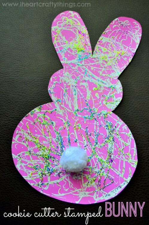 Pour white paint on your small paper plate. Dip the carrot cookie cutter into the paint and stamp the bunny. Continue dipping the cookie cutter into the paint and stamping the bunny as much you want. You can clearly see that the carrot shape is not recognizable in my daughter’s bunny. She really covered it well. Your child may not choose to cover it with as many stamps, but it will still look great!