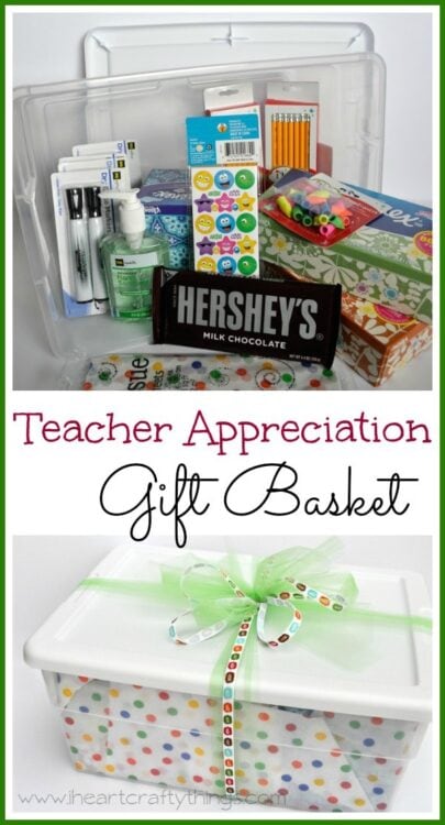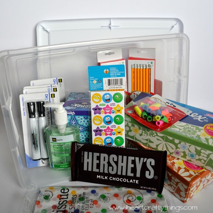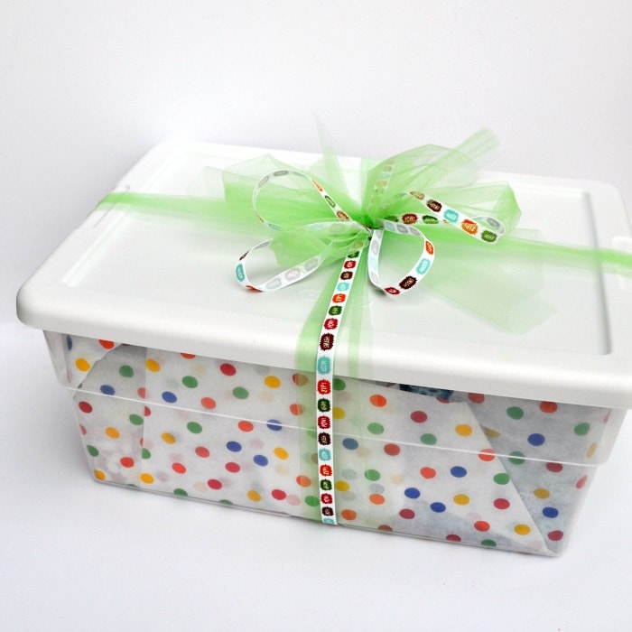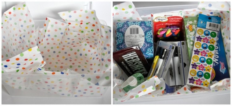 My children are on a year round school schedule and have to switch classrooms a few times a year. With that in mind, I choose to use a plastic container to house our gifts rather than a traditional basket so that the container can help teachers store supplies for when they change classrooms. What teacher can’t use more storage containers anyways, right?