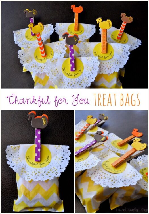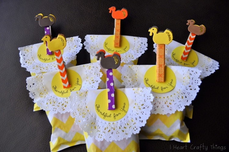 I bought the little yellow chevron bags from Pick Your Plum. I folded a small doily over the top with a 2″ yellow circle with “Thankful for You” printed on it. I clipped it together with these Turkey Clothespin Clips I made.