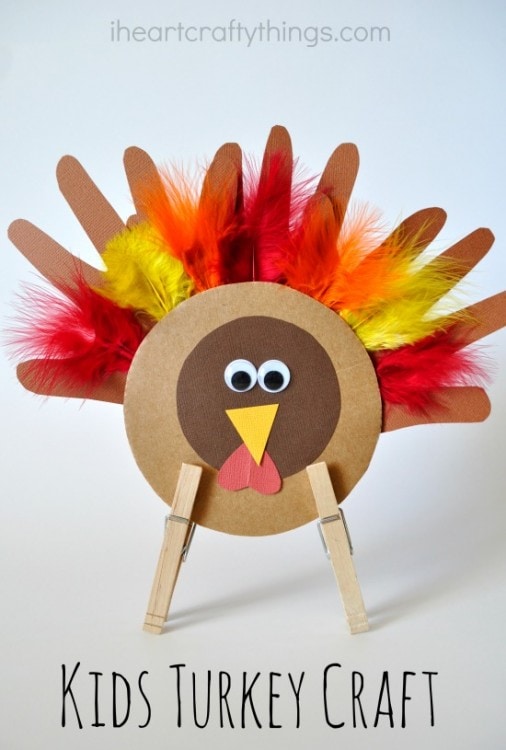 This cute kids turkey craft boasts handprints to give it some personal flair and the clothespin legs add an extra fun touch making it able to stand on it’s own. Hurry and grab your supplies and lets get our turkey crafting on!