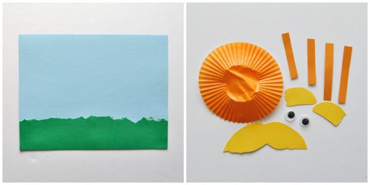 1. Start by ripping along the bottom of your green sheet of cardstock paper and glue it onto the bottom of your blue sheet of cardstock paper.