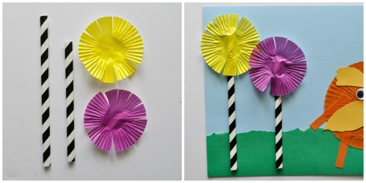 5. Trim your straws to make them different lengths and glue them onto your paper. Glue your mini cupcake liners at the top of your straws.