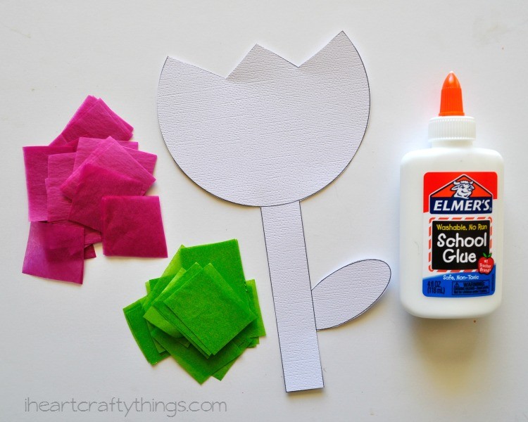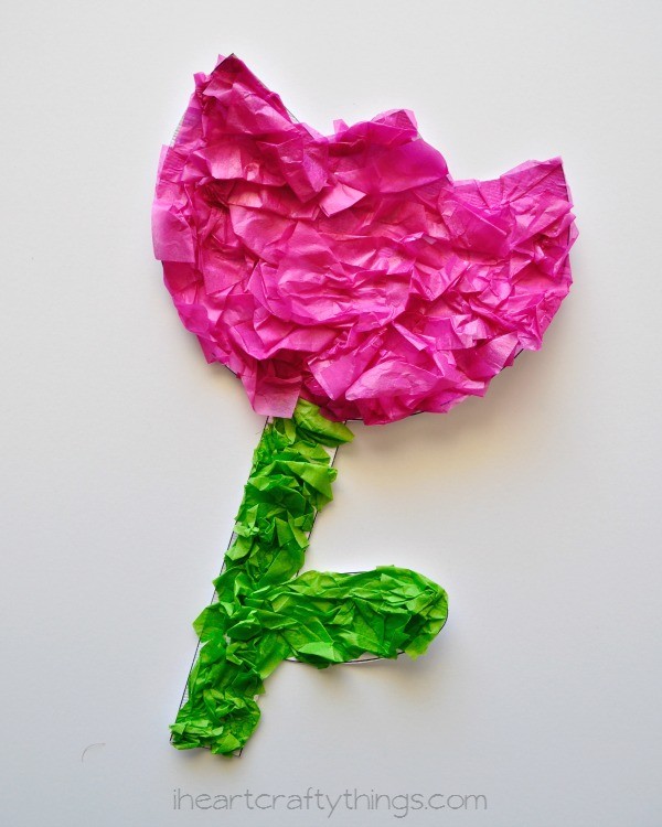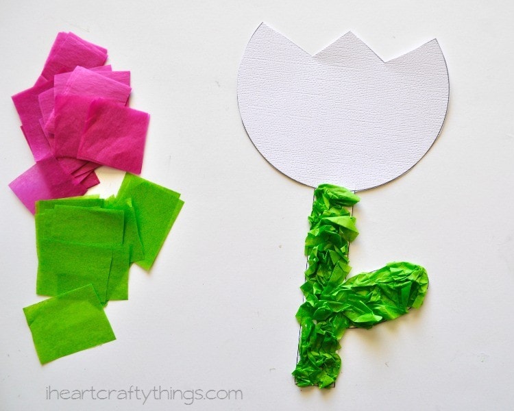 4. Add school glue all over the tulip flower and cover it with your pink tissue paper squares (or color of your choice). Let the glue dry completely.