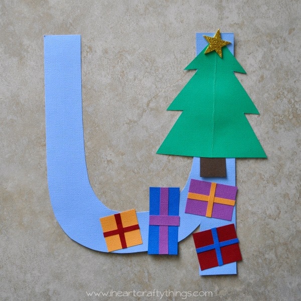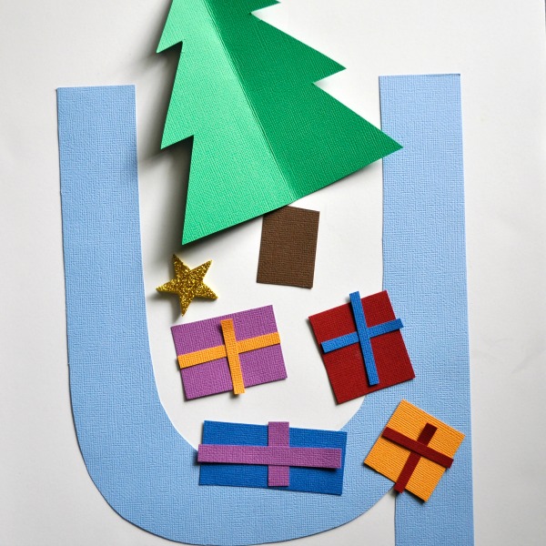 Glue your Christmas tree at the top of your U. Add your star sticker at the top of your tree. (Optional: Decorate your tree with glitter glue, sequins, or markers)