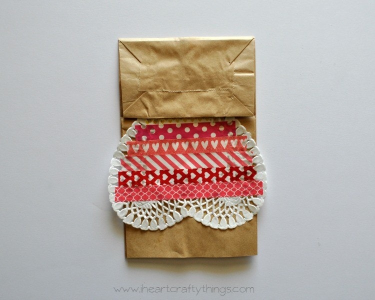 Decorate your heart doily with washi tape and then glue the doily upside down onto your paper bag.