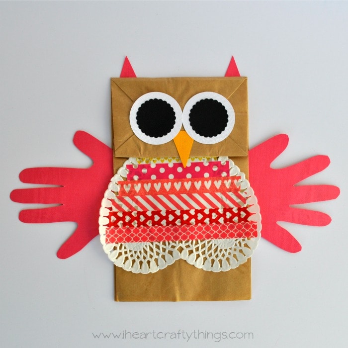 Now your child can walk around with their puppet on their arm and say “Whoo-Whoo! Whoo will be my Valentine?”