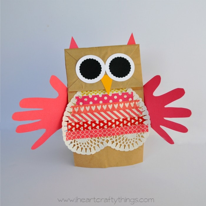 Washi tape is one of my weaknesses. I think it must be the bright, cute patterns, but sometimes I just can’t hold back when I see it. My sister-in-law saw some on sale recently online and I couldn’t pass up the chance to get some new patterns and colors in my collection. When it arrived in the mail last week my daughter and I quickly got to work thinking of a craft we could make with it. We put together this fun Paper Bag Owl Puppet that is perfect for a fun Valentine’s Craft with it’s pink hues and belly heart.