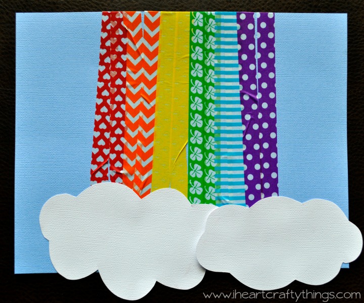 3. Cut out a couple clouds from your white sheet of cardstock paper and glue them to the bottom of your washi tape rainbow. Here is my daughter’s rainbow craft.