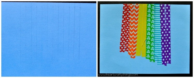 2. Cut strips of tape, in color order of the rainbow and place them on the lines drawn on your paper. We did two strips of tape per color to make our rainbow bigger. Don’t worry about any tape hanging over the top of the paper because you can just fold it over the back of the paper.