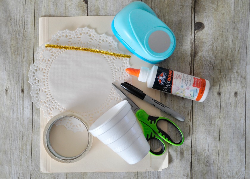3. Use your 2-inch circle punch to cut out a circle out of your manila folder. Use your black marker to draw eyes and a mouth on your circle. Either use tape or tacky glue to attach the angel face onto the front of the foam cup.