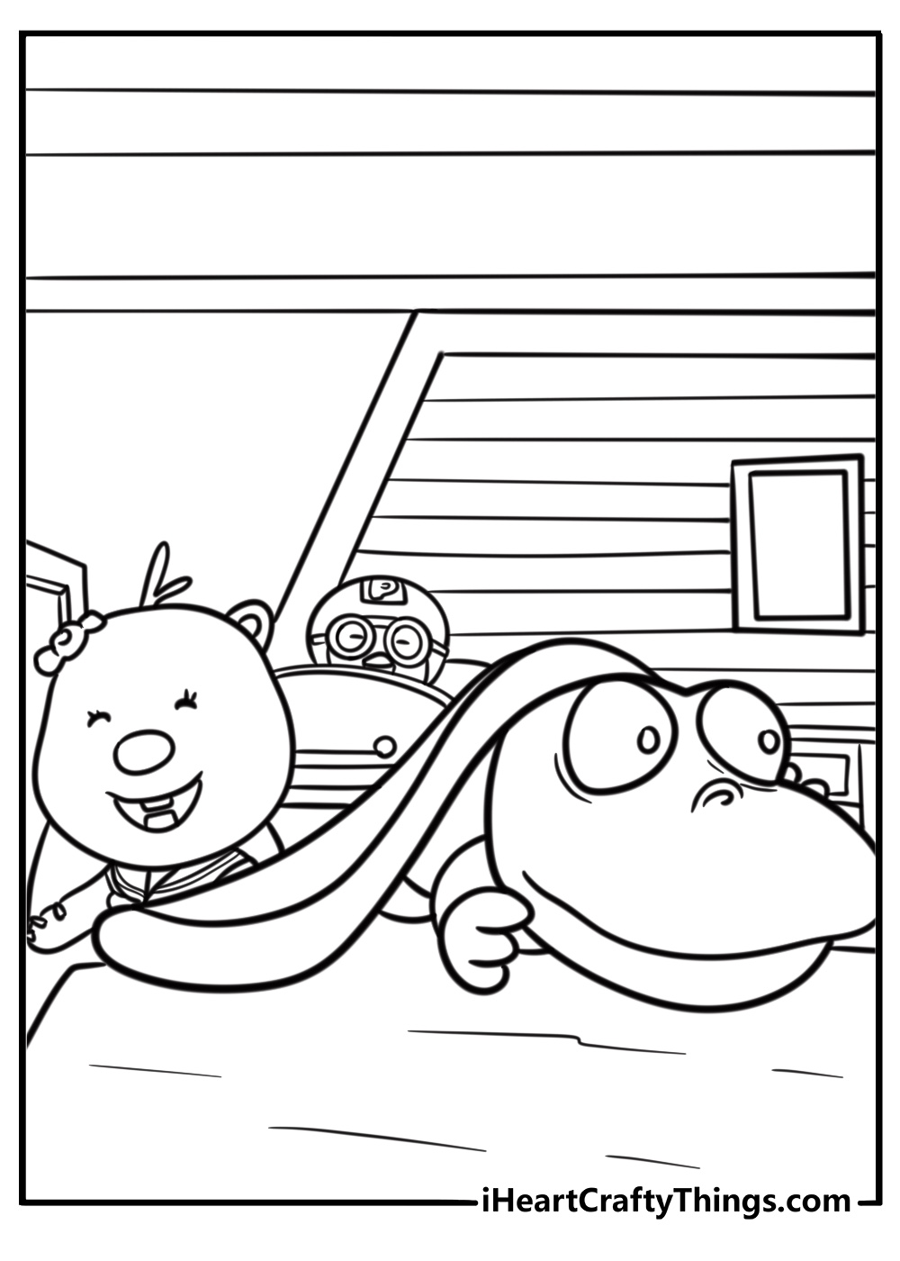 Poby the polar bear is one of Pororo’s best friends, and despite his big size, he is a very gentle soul. It could be fun to draw the title of your child’s favorite book on the one he is reading!