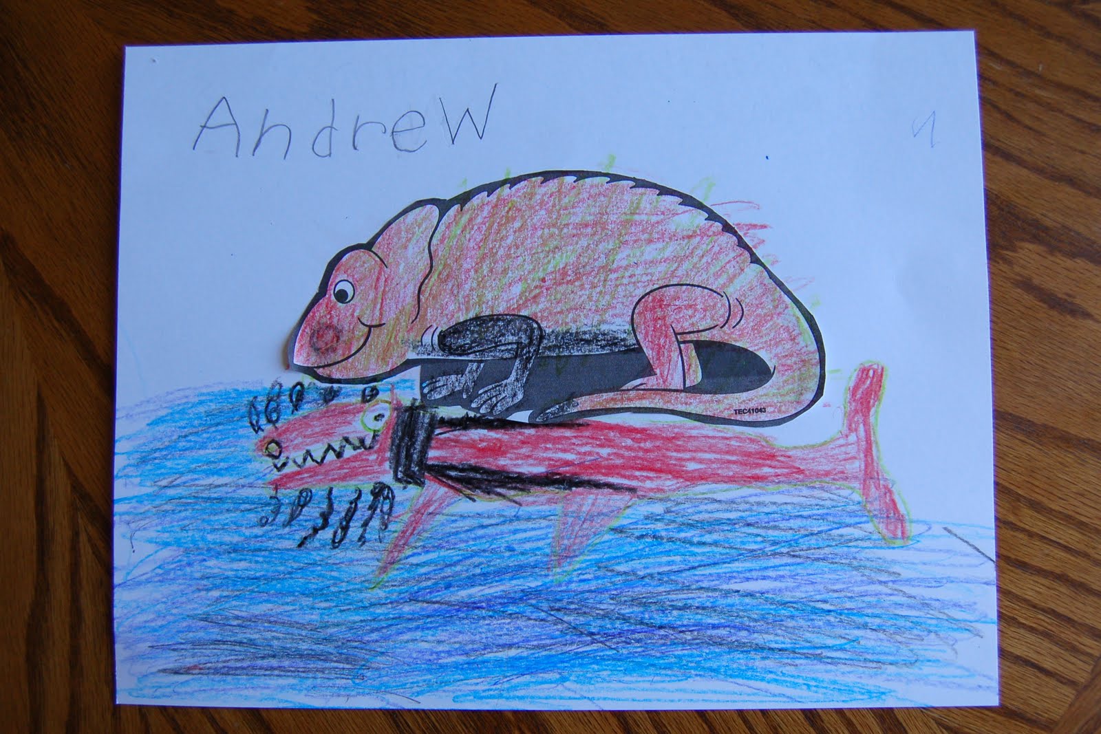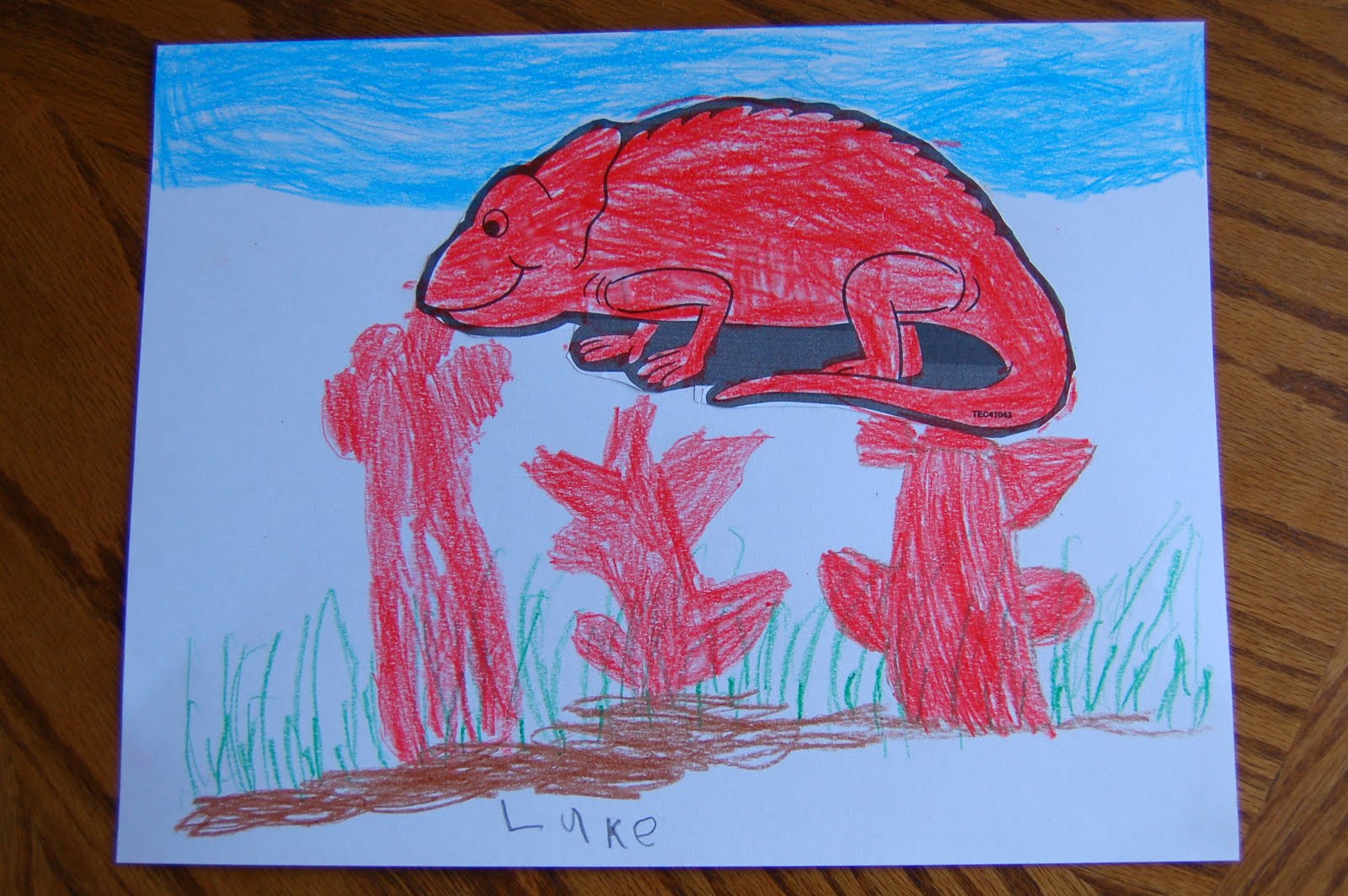 Color your Chameleon to match your object and add any finishing touches. My oldest son put his Chameleon on top of a catfish so he added water to his picture and my youngest son put his Chameleon on top of red flowers so he added sky to his picture above the Chameleon.
