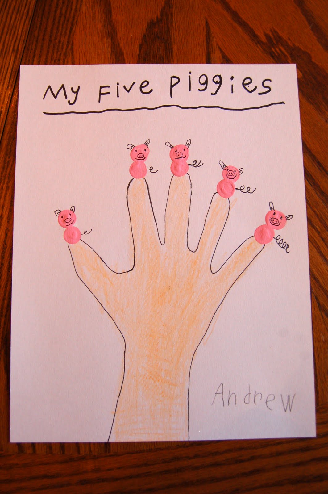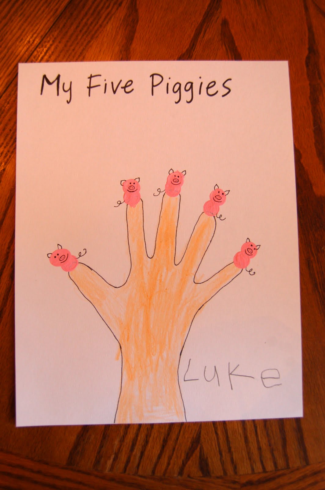 At the top of the paper write “My Five Piggies” and have your child write their name on the bottom of the paper. I had to write the words at the top for my 4-year old but my 6-year old was obviously able to do it by himself. Now you are finished!