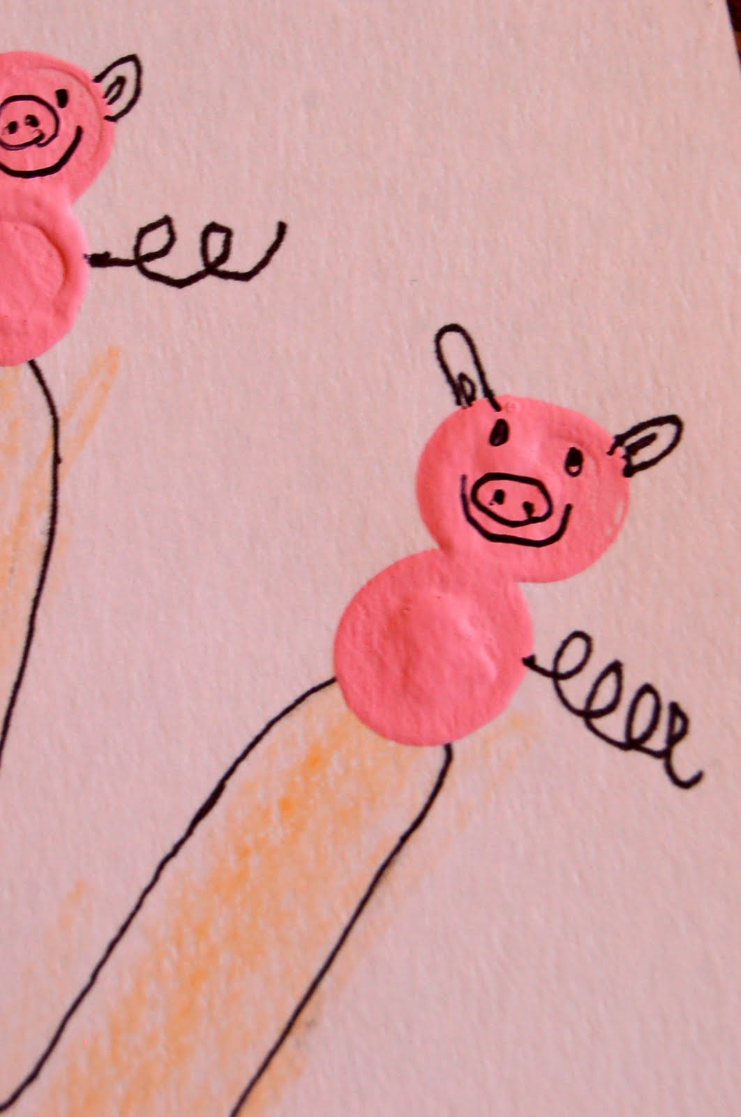Next dip the bottom of your marker into the pink paint and press it on top of each finger twice to make a pig head and body. You could also use fingerprints if you want.