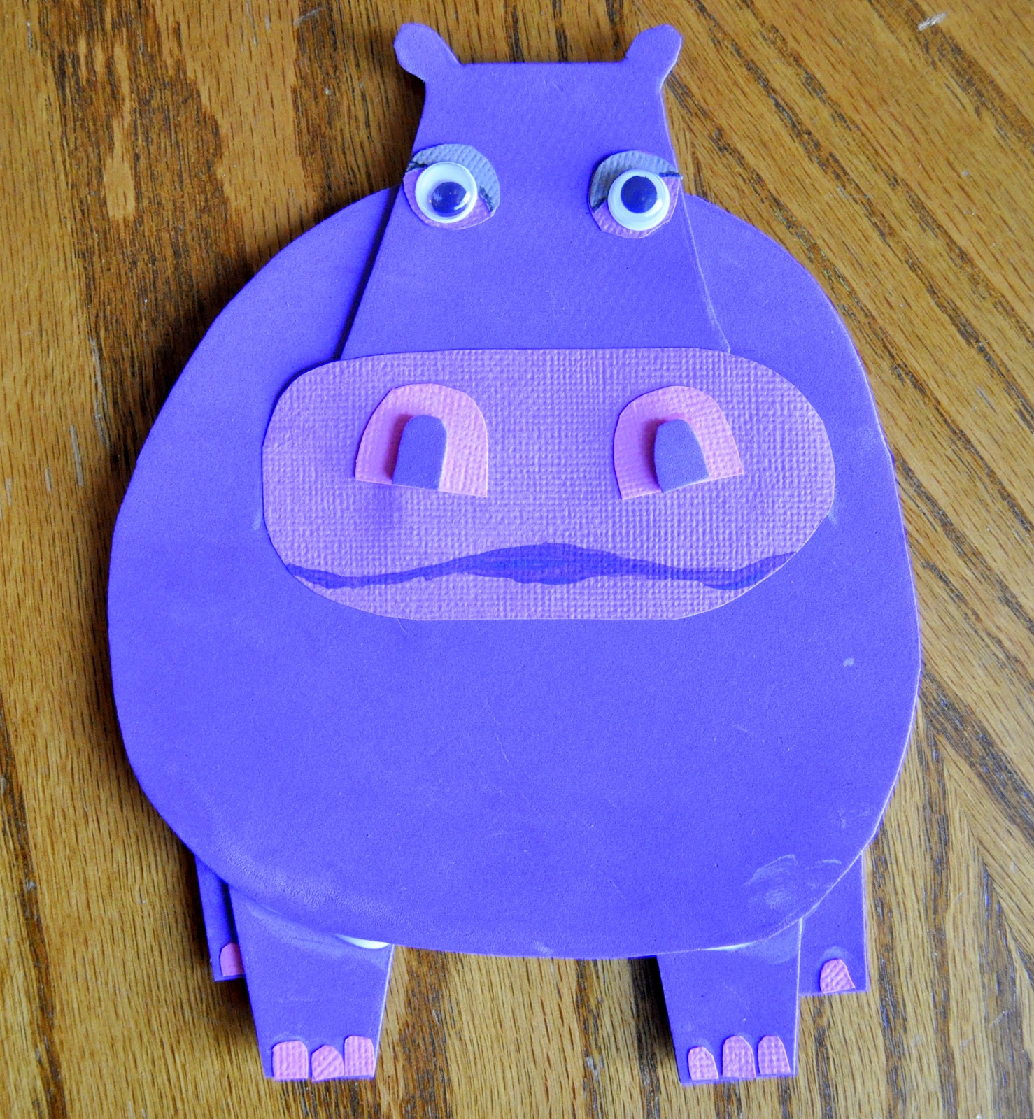Here is the completed Hippotamus. I used a purple foam sheet to make the Hippo because it was the only dark purple I had. If I had darker purple card stock paper, I would definitely use that instead. I simple cut out all the Hippo pieces and glued them together. I used a lighter purple for the mouth and eyes, as you can see. There is also some gray on the eyes with a black thin black line, kind of like the artwork.