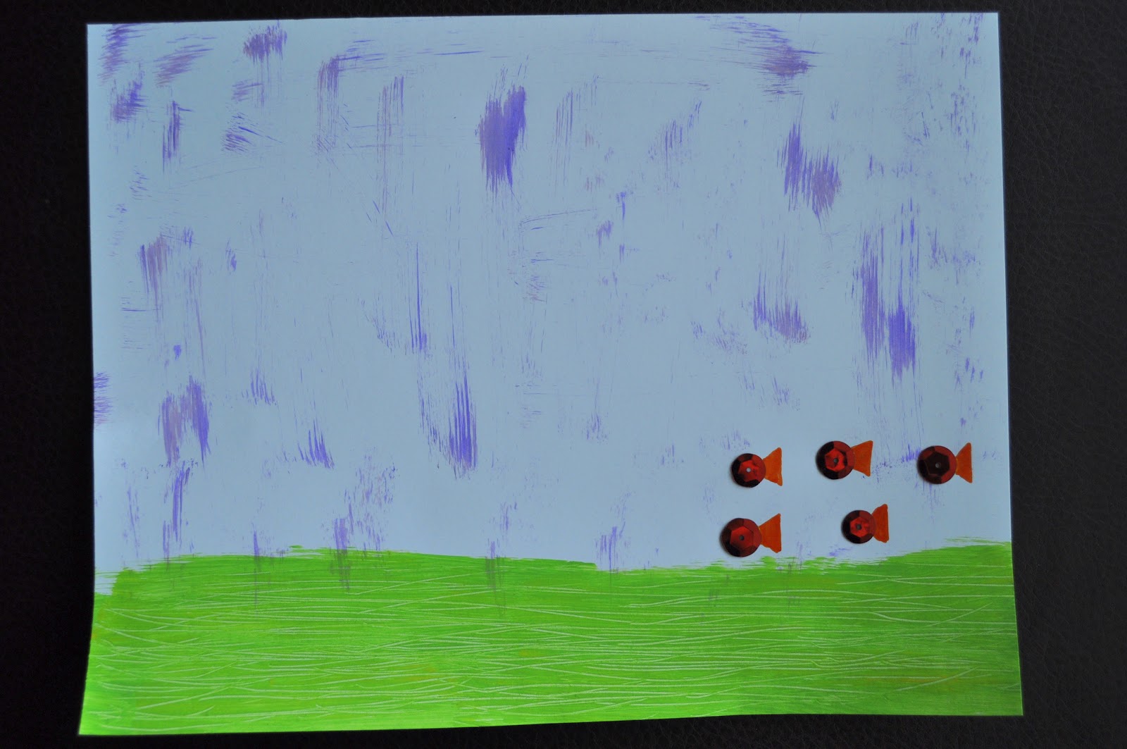 For the ground I mixed green and yellow and brushed it on. Then while it was still wet I used a fork to make the texture in it.